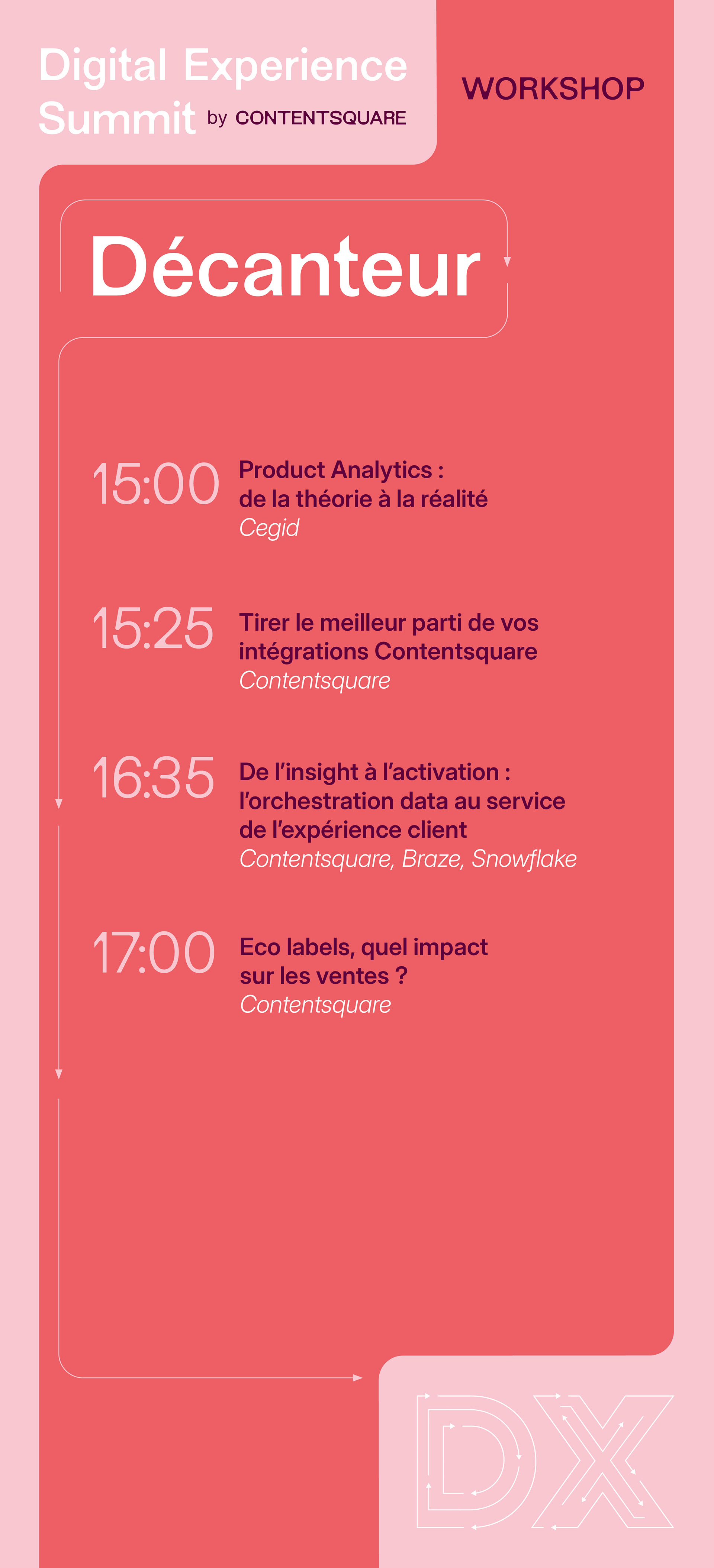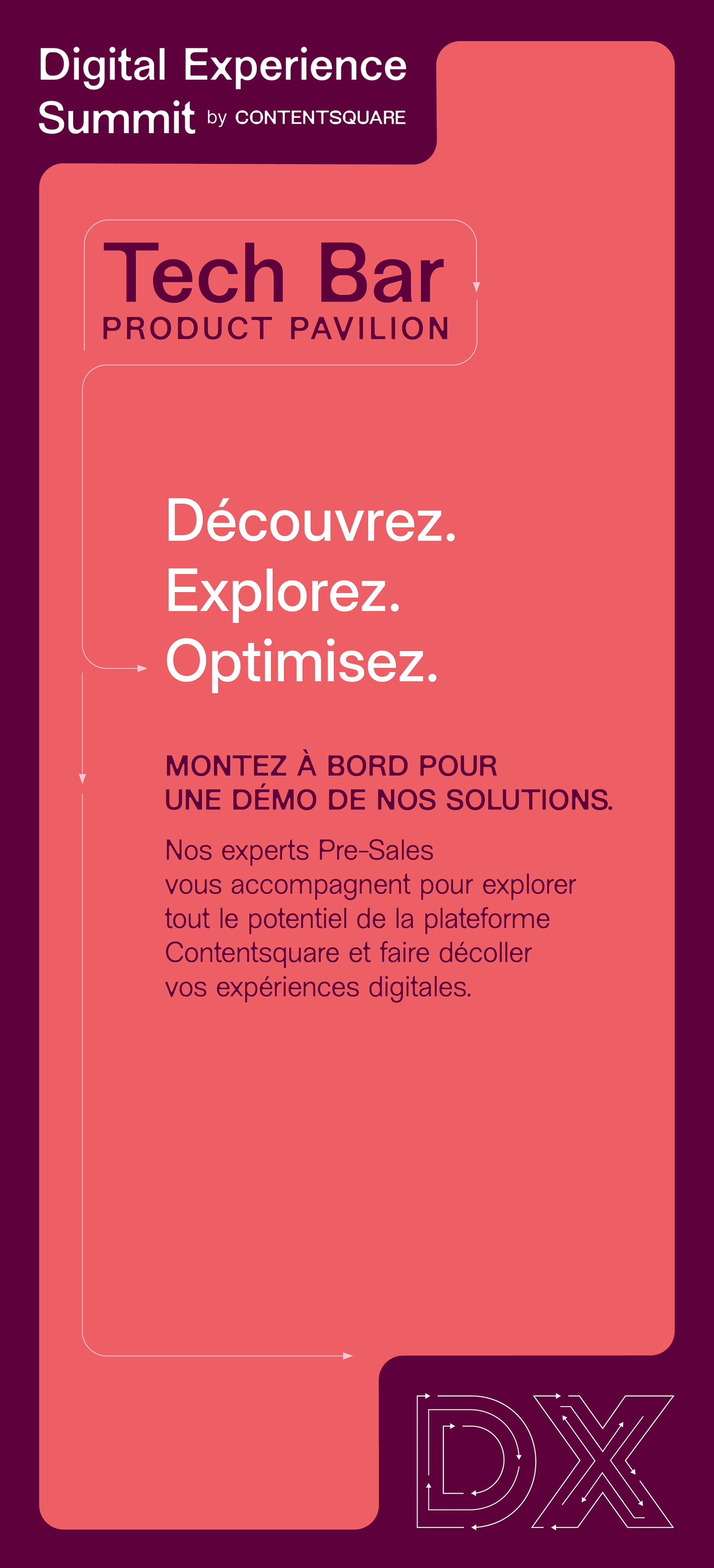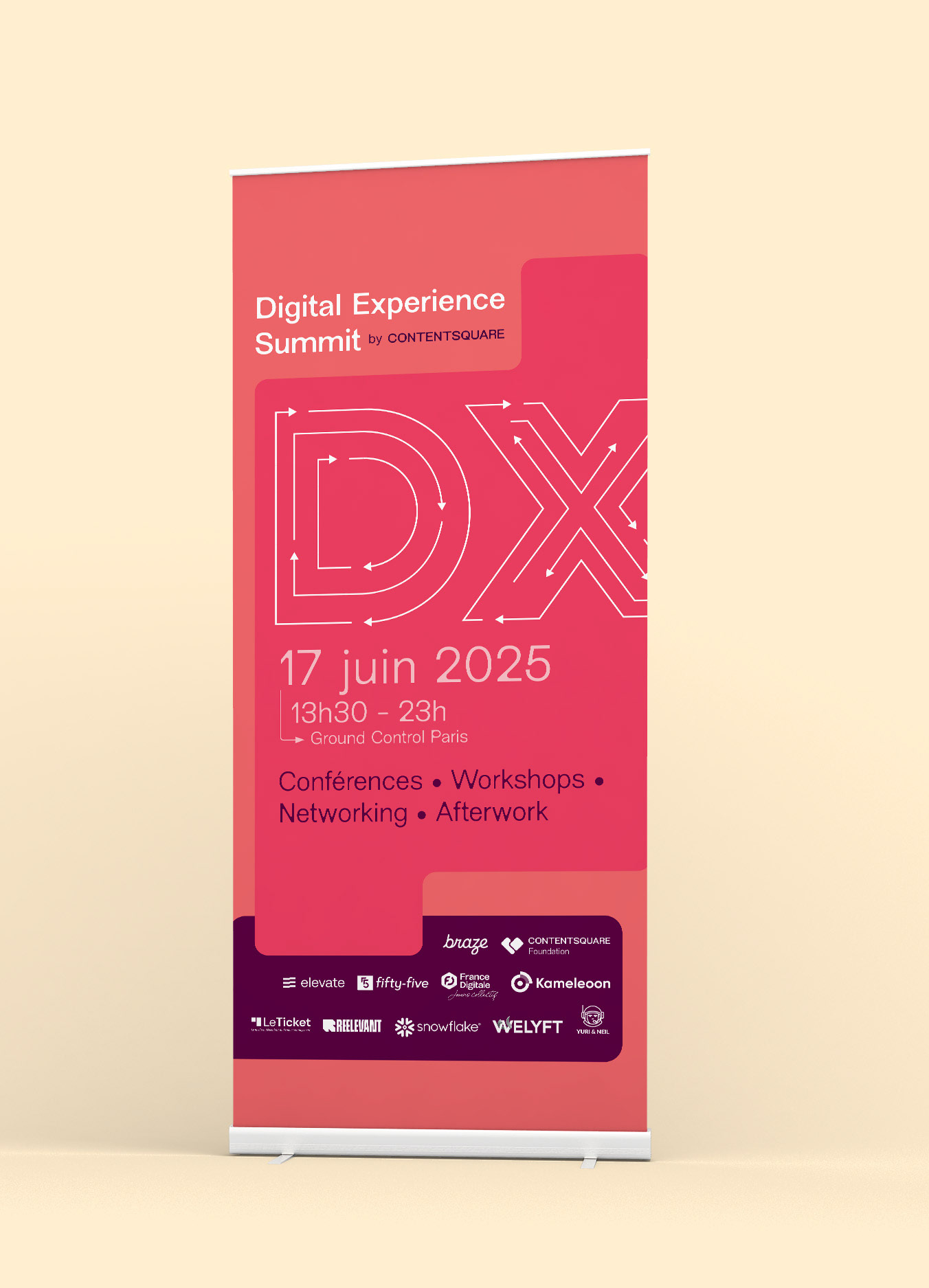 "Le Digital Experience Summit 2025, organisé par Contentsquare à Ground Control (Paris), était un événement phare dédié à l’innovation digitale, réunissant plus de 550 professionnels autour de thèmes comme l’IA, la personnalisation et l’accessibilité. Mon rôle ? Donner une identité visuelle forte et cohérente à cette expérience, en collaboration avec l’agence Cocotte Communication, pour que chaque détail reflète l’ambition et les valeurs de l’événement."
